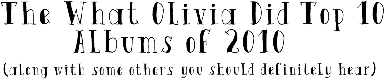 Everything Everything- Man Aive, Foals- Total Life Forever,Surfer Blood- Astrocoast, Mystery Jets- Serotonin, Two Door Cinema Club- Tourist History, Kate Nash- My Best Friend Is You, Hurts- Happiness, LCD Soundsystem- This Is Happening, Marina & The Diamonds- The Family Jewels, Crystal Castles- Crystal Castles, Delphic- Acolyte, Warpaint- The Fool, Gorrilaz- Plastic Beach, Laura Marling- I Speak Because I Can.