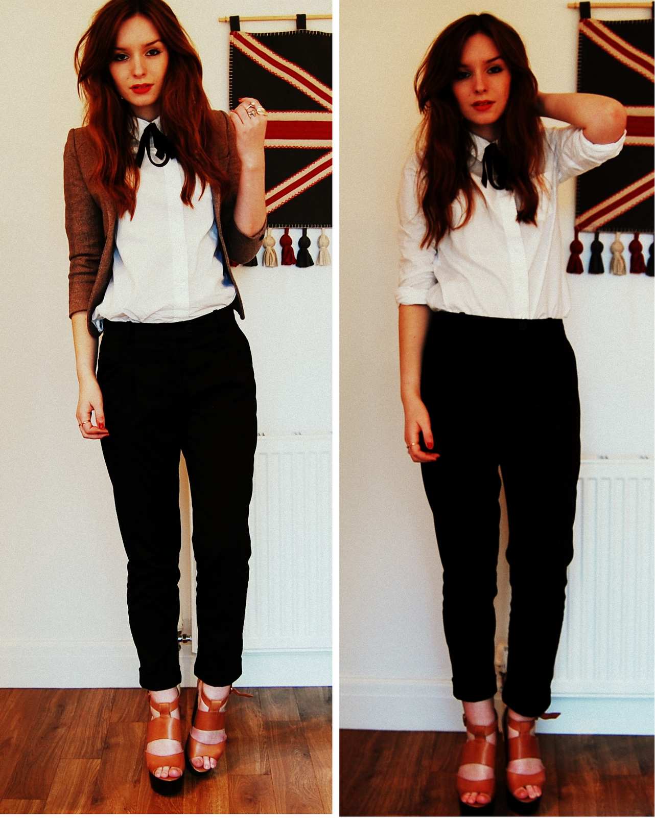 (Tweed blazer: Vintage, Blouse: Topshop, Ribbon, Trousers: Topshop, Shoes: Topshop)This outfit post looks pretty similar to my last despite the fact the outfit is different (i also look really ‘posey’ so I apologise for that!), i think it’s because of the background… hmm.